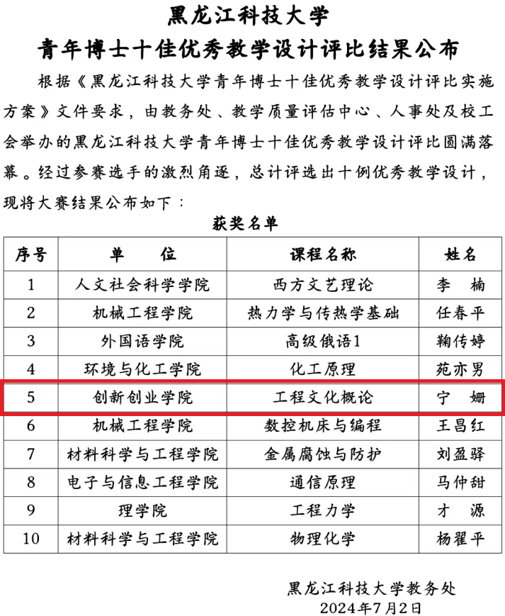 2024年7月2日,校青年博士十佳优秀教学设计评比结果公布,公司教师宁姗获十佳优秀教学设计奖。