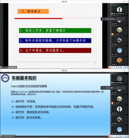 罗凤利对工程训练基地前几周线上教学运行情况,提高线上教学质量等进行了介绍和总结,并强调了本次青年教师试讲的目的和意义及相关要求。5位青年教师程晓波、梁志强、潘丽、安兴伟和靳晓明分别进行了车工训练、铸造训练、铣削训练、焊接训练和锻压训练的讲授。基地教师们分别从课程的准备程度、讲授过程、专业知识的规范性、学情分析、员工互动、课程思政等多个方面提出了中肯的意见和建议。在点评过程中,教师们还结合正在进行的线上教学的授课内容改进、线上教学互动、提升线上教学质量等进行了探讨,提出了很多改进的方法和措施。
