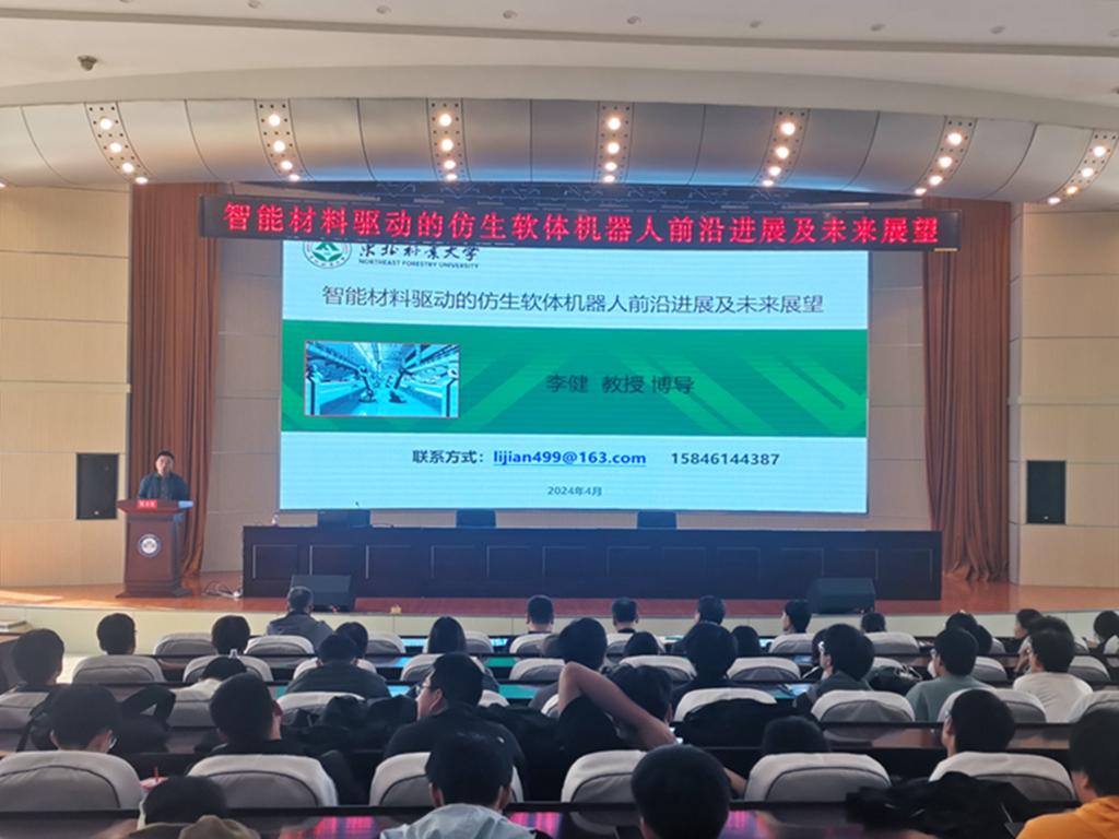 4月25日东北林业大学李健教授应永利yl(工程训练中心)邀请,在信息楼报告厅以《智能材料驱动的仿生软体机器人前沿进展及未来展望》为题目做了学术报告。报告会由李强副经理主持,来自永利yl、研究生公司和机械、材料、电气、电信、计算机等公司的220多名师生参加了本次学术交流活动。